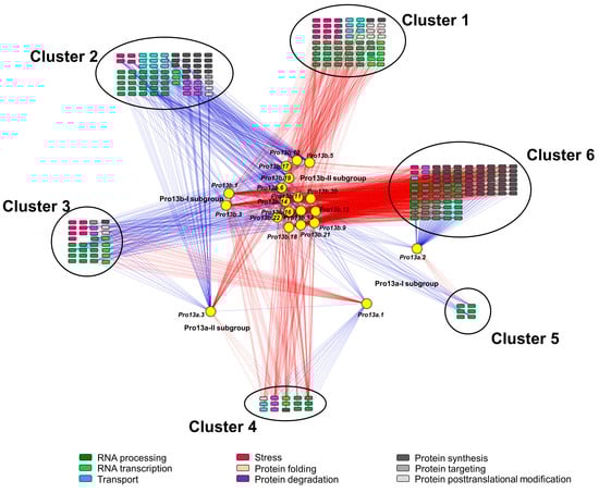 To investigate patterns of transcriptional change among prolamin genes in the immature seeds of WT, 1a-8-1, 2a-2-1, 4b-9-7, and 8b-3-9 plants, Pearson correlation analysis was performed among 927 DEGs and prolamin genes. This analysis identified 746 transcripts with a correlation coefficient ≥|0.7| (Table S6). We then constructed a correlation network based on GO enrichment categories such as RNA processing (BIN27.1), RNA transcription and RNA regulation of transcription (BIN27.2 and 27.3), protein synthesis ribosome (BIN29.2.1 and 29.2.6), protein synthesis transfer RNA (BIN29.2.7), protein synthesis elongation (BIN29.2.4), protein folding (BIN29.6), protein degradation (BIN29.5), protein posttranslational modification (BIN29.4), protein targeting (BIN29.3), stress (BIN20), and transport (BIN34) (Figure 7). Furthermore, the results revealed that Pro13a.1 and Pro13a.2 genes in the Pro13a-I subgroup are negatively correlated with genes in the Pro13a-II and Pro13b-I/II subgroups. Genes in the network formed six clusters with distinct patterns of correlation with prolamin genes, as follows: Cluster 1 shows positive correlation with genes in the Pro13a-II and Pro13b-I/II subgroups; cluster 2 demonstrates an inverse association with cluster 1, displaying a negative correlation with genes in the Pro13a-II and Pro13b-I/II subgroups; cluster 3 exhibits a positive correlation with the Pro13a.1 gene but a negative correlation with genes in the Pro13a-II and Pro13b-I/II subgroups, whereas its opposite is cluster 4; similarly, cluster 5 shows a positive correlation with Pro13a.2 gene and a negative correlation with genes in the Pro13a-II and Pro13b-I/II subgroups, with cluster 6 being its opposite (details in Table S7). The network reveals which genes are correlated with each prolamin gene. Thus, the results suggest that transcriptional regulatory mechanisms may exist and may explain how and why altered expression of some prolamins is accompanied by compensatory changes in expression of other prolamins and other network genes.