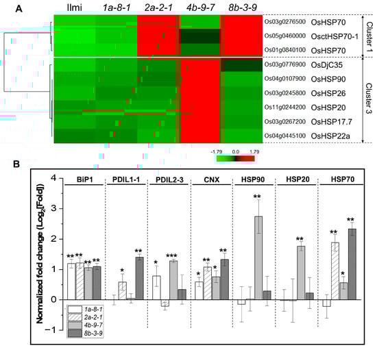 Of the genes involved in the “Protein processing in the endoplasmic reticulum” pathway, nine genes play roles in ER-associated degradation processing (ERAD). These include HSP70 (Os03g0276500, Os05g0460000, and Os01g0840100) in cluster 1 and OsDjC35 (Os03g0776900), HSP90 (Os04g0107900), HSP26 (Os03g0245800), HSP20 (Os11g0244200), HSP17.7 (Os03g0267200), and HSP22a (Os04g0445100) in cluster 3. Three HSP70 genes in cluster 1, which are positively correlated with prolamin genes in the Pro13a-II and Pro13b-I/II subgroups, were up-regulated in 2a-2-1 and 8b-3-9 mutants. Six genes in cluster 3, which are positively correlated with the Pro13a.1 gene but negatively correlated with the Pro13a.3 and prolamin genes in the Pro13b-I/II subgroups, exhibited increased expression in 4b-9-7 mutants (Figure 8A). qRT-PCR analysis of the expression of HSP20, HSP70, and HSP90 revealed a strong correlation between RNA-seq and qRT-PCR estimates of the expression of these genes (see Pearson’s correlation plot in Figure S6). Furthermore, the expression of four genes, BiP-1, PDIL-1-1, PDIL-2-3, and CNX, which are associated with misfolded protein repair, was also examined (Figure 8B). The results showed that transcription of BiP-1 and CNX genes was consistently 1.5 to 2-fold higher in the immature seeds of the 13 kDa prolamin-knockout lines than in WT plants. However, the expression of PDIL1-1 was higher in 2a-2-1 and 8b-3-9 plants than in WT, while the expression of PDIL2-3 was higher in 1a-8-1 and 4b-9-7 plants than in WT, showing no consistent trend.