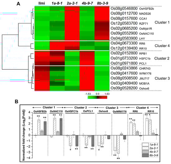 As above, qRT-PCR analysis was performed to validate the findings observed with RNA-Seq data (Figure 9B). We focused on eight candidate TF genes grouped into four clusters: OsHsfB2b and OsNAC110 in cluster 1, OsPCL1 and OsHsfC1b in cluster 2, Oshox6 and OsWRKY76 in cluster 3, and RR6 and RR10 in cluster 4. In cluster 1, OsHsfB2b (Os08g0546800) and OsNAC110 (Os09g0552900) exhibited significantly higher expression in lines 2a-2-1 and 8b-3-9, while OsPCL1 (Os01g0971800) and OsHsfC1b (Os01g0733200) in cluster 2 showed the opposite trend. In addition, Oshox6 (Os09g0528200) and OsWRKY76 (Os09g0417600) in cluster 3 displayed markedly lower expression in lines 1a-8-1 and 2a-2-1, whereas RR6 (Os04g0673300) and RR10 (Os12g0139400), grouped in cluster 4, showed significantly higher expression in these lines. Pearson’s correlation analysis indicated a strong correlation between RNA-Seq values and qRT-PCR data for these TFs, demonstrating a high level of agreement between the two datasets (Figure S6).
