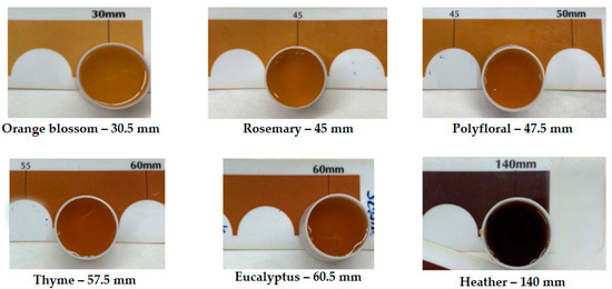The colour of honey is influenced by various factors and holds significant commercial importance, as it directly impacts its pricing. The richness of honey in calcium phosphate and iron increases with its darkness. The globally standardised method for measuring honey colour involves optical comparison using the Pfund scale comparator [25], with the results depicted in Figure 1. This method expresses colour in millimetres, spanning from white to dark brown tones. Analysis revealed that the orange blossom honey exhibited the lightest colour at 30.5 mm, while the heather honey displayed the darkest colour at 140 mm.