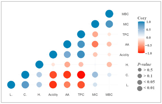 Correlation analysis between all the variables analysed, colour parameters (L*, C*, and H*), acidity, antioxidant activity (AA), total phenolic content (TPC), minimum inhibitory concentration (MIC), and minimum bactericidal concentration (MBC) in the honey samples.