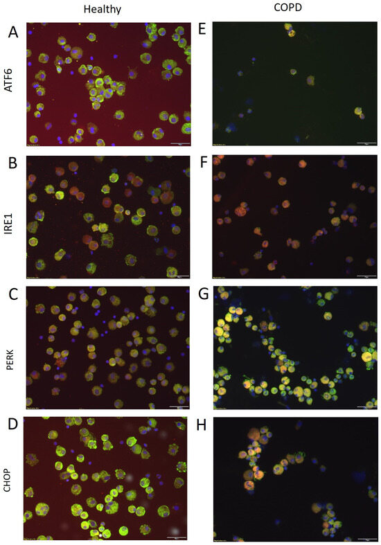 Immunofluorescence stainings of ER together with ER stress mediators in BAL cells were performed to visualize the expression of ATF6, IRE1, PERK, and CHOP in healthy (Figure 2A–D) and COPD subjects (Figure 2E–H). Co-staining of the ER and the ER stress mediators was observed in macrophage, eosinophil, and neutrophil cells, but was not present in lymphocytes (identified by morphology).