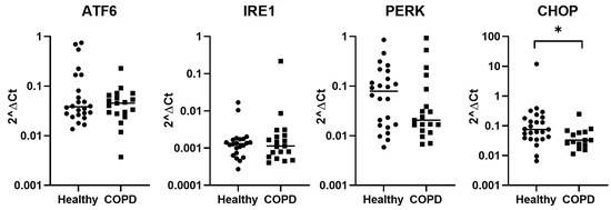 Baseline gene expression of stress-related genes in lung fibroblasts from healthy and COPD subjects. In ATF6, IRE1, and PERK: healthy n = 27 and COPD n = 22, and in CHOP: healthy n = 25 and COPD n = 16. Data are presented as individual values and median. The Mann–Whitney test was used for statistical analysis. * = p < 0.05.