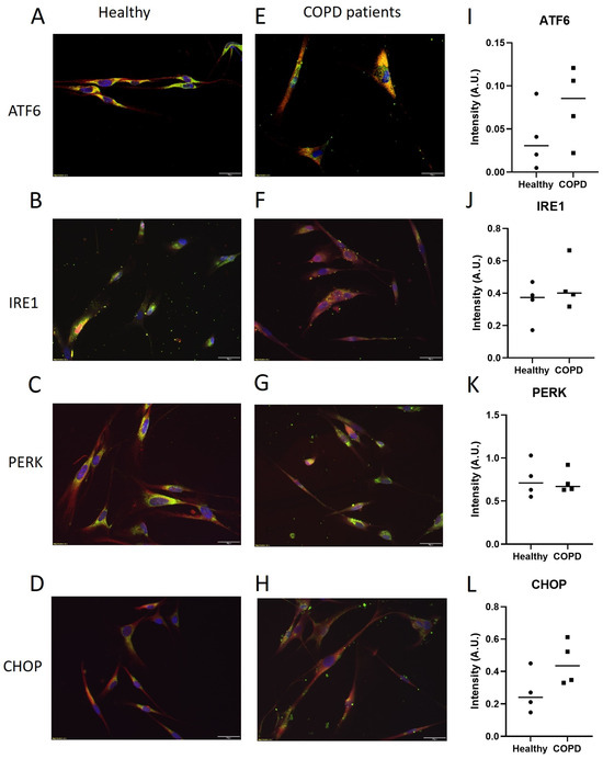 Staining of the ER stress mediators in lung fibroblasts was performed to visualize the localization of ATF6, IRE1, PERK, and CHOP in healthy (Figure 4A–D) and COPD subjects (Figure 4E–H). The stainings showed co-localization of the ER and the ER stress mediators in the lung fibroblasts. There were no quantifiable differences in the Western blot of the proteins between the two groups (Figure 4I–L), though, both ATF6 and CHOP tended to be higher in lung fibroblasts from COPD subjects compared to healthy subjects.