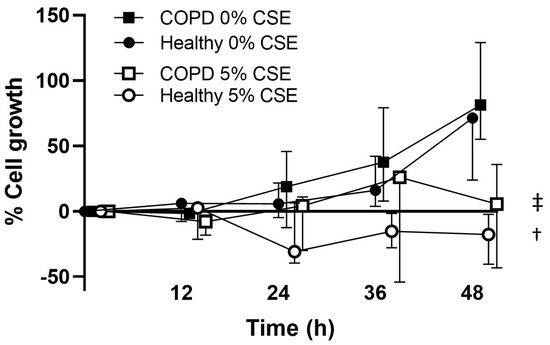 To investigate the potential effect of CSE on lung fibroblasts, the proliferation of lung fibroblasts from healthy and COPD subjects was quantified using the HoloMonitor. We found that the proliferation of lung fibroblasts from both healthy and COPD subjects was inhibited during exposure with 5% CSE at 48 h (p = 0.05 in both, Figure 5), with no significant differences between COPD and healthy subjects.