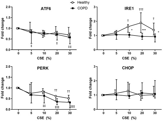 There was, subsequently, a difference between healthy and COPD subjects’ lung fibroblasts in the IRE1 response (CSE 10%: p = 0.049, 20% p = 0.0004, and 30% p = 0.023 compared to 0%), but not in ATF6, PERK, or CHOP.
