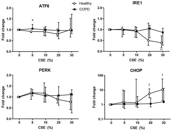 Gene expression of stress-related genes, ATF6, IRE1, PERK, and CHOP, in lung fibroblasts from healthy (n = 9) and COPD (n = 7) after stimulation with 0–30% cigarette smoke extract (CSE) for 4 h. Data are presented as median and interquartile range. All values are presented as ratios relative to the respective individuals’ result at 0% CSE. Mixed-effects analysis was used for statistical analysis. * = p < 0.05 between healthy and COPD at 5% CSE, † = p < 0.05 or †† = p < 0.01 significant difference between 0% and the respective concentrations of CSE in healthy subjects.