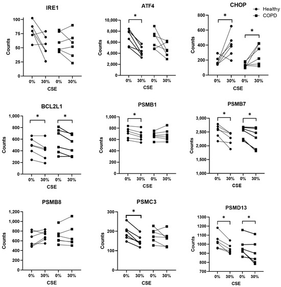 Since there was a tendency for differential expression in both IRE1 and PERK at 30% CSE, additional ER stress-related genes were further investigated (Figure 8) from a previously reported and broadly assessed NanoString panel [10]. ATF4, a component downstream of PERK, was decreased in healthy subjects after 30% CSE exposure (p = 0.028). Expression of CHOP was increased in healthy subjects (p = 0.046) (similarly to the qPCR results presented in Figure 7) and in COPD subjects (p = 0.046) after 30% CSE exposure. The expression of Bcl2L1 was decreased in both healthy (p = 0.046) and COPD subjects (p = 0.046) in response to 30% CSE. Unlike the qPCR, the more sensitive NanoString also found changes in the gene expression of several proteasomal units. This included decreased expression of PSMB1 and PSMC3 in healthy subjects (p = 0.028 and p = 0.028, respectively), and decreased expression of PSMB7 and PSMD13 in both healthy (p = 0.028 and p = 0.028, respectively) and COPD subjects (p = 0.028 and p = 0.046, respectively) after 30% CSE stimulation. Overall, there were more changes in gene expression in the healthy lung fibroblasts than the COPD lung fibroblasts when exposed to CSE.