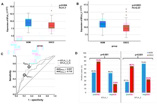 Both examined BTLA transcript variants (BTLA_1 and BTLA_2) showed significantly increased expression in OSCC compared to NOM. The mean ∆CT value of BTLA_1 in OSCC (n = 73) amounted to 8.1 and that of BTLA_2 to 9.74. In the NOM Group (n = 59) mean ∆CT was 9.46 for BTLA_1 and 10.98 for BTLA_2, respectively (Table 2, Figure 2A,B). Fold changes calculated by the ∆∆CT method revealed a prominent overexpression in the OSCC group (FCBTLA_1 = 1.7, FCBTLA_2 = 2.4; Table 2). The statistical significance of differential expression between the groups were shown by the Mann–Whitney U test (PBTLA_1 = 0.004, PBTLA_2 = 0.0001; Table 2, Figure 2A,B).