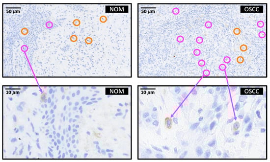 BTLA protein expression in OSCC tumor tissue (OSCC) and healthy control mucosa (NOM). Representative micrographs showing the typical expression pattern of BTLA in OSCC and NOM. For example, cells counted positive are circled in orange in the stromal compartment and circled in purple in the epithelial compartment. The respective scale and type of tissue—OSCC or NOM—is also shown in the respective tissue section. In the immunohistochemical part of the study we assessed the labelling index ((positive cells/all cells) × 100) in tumor tissue compared to healthy controls. We did not assess the staining intensity of the BTLA expressing cells. A clear allocation to lymphocytes is not possible as we did not perform multi-stainings. Morphologically, the BTLA-expressing cells are tumor-infiltrating immune cells.
