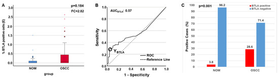 Comparison of the expression rates of BTLA in the epithelium determined by IHC. As the whole tissue is included in the analysis in PCR, this value cannot necessarily be extrapolated to the results of IHC, where only the sub-epithelium is considered. In addition, low values in RT-qPCR indicate higher expression rates, as a low CT value indicates a higher amount of mRNA and thus increased expression or transcription. In IHC, a higher percentage of LI directly indicates a higher number of positive cells [LI = (stained cells/total cells) × 100], so the differences are inverse. (A) Boxplots and MWU tests show a prominent epithelial overexpression of BTLA protein in the OSCC compared to the NOM. (B) ROC curve and AUC value indicate a significant relation between evaluated BTLA protein expression and malignant tissue. The circle shows the point of the highest Youden (Y) index that is associated to the COP stated as a definite IL value. (C) A significant association between OSCC diagnosis and protein expression above the COP in the epithelium was seen (χ2-test). asterisk = extreme values, Dots = outlier.