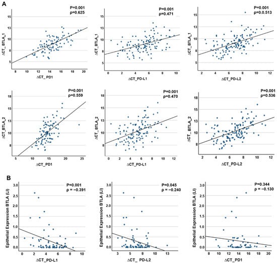 The discrepancy between the ratios of the values determined for the expression rates using RT-qPCR and immunohistology is due to the method used to analyse the expression. For example, low ∆CT values in RT-qPCR indicate higher expression rates, as a low CT value indicates a higher amount of mRNA and thus increased expression or transcription. In IHC, a higher percentage of LI directly indicates a higher number of positive cells [LI = (stained cells/total cells) × 100] and directly represents increased expression. In Figure 5A, the values for both BTLA and PD1, PD-L1 and PDL are determined by RT-qPCR. Here the correlation is positive because the ∆CT values decrease with increasing expression of the genes. Figure 5B compares the values from IHC with those from RT-qPCR. As higher values of LI and decreasing ∆CT values stand for increased expression, the values here are inversely correlated i.e., negative. In reality, however, the higher the expression of the protein, the higher the expression of the coding mRNA.