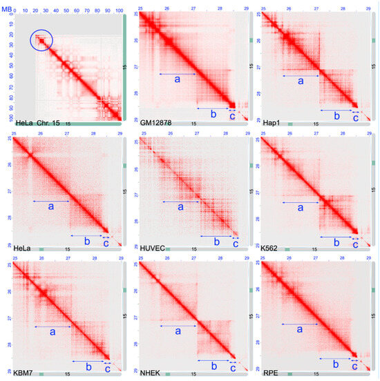 - Rao, S.S.; Huntley, M.H.; Durand, N.C.; Stamenova, E.K.; Bochkov, I.D.; Robinson, J.T.; Sanborn, A.L.; Machol, I.; Omer, A.D.; Lander, E.S.; et al. A 3D map of the human genome at kilobase resolution reveals principles of chromatin looping. Cell 2014, 159, 1665–1680. [Google Scholar] [CrossRef]