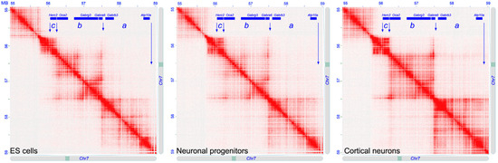 - Bonev, B.; Cohen, N.M.; Szabo, Q.; Fritsch, L.; Papadopoulos, G.L.; Lubling, Y.; Xu, X.; Lv, X.; Hugnot, J.-P.; Tanay, A.; et al. Multiscale 3D Genome Rewiring during Mouse Neural Development. Cell 2017, 171, 557–572. [Google Scholar] [CrossRef]