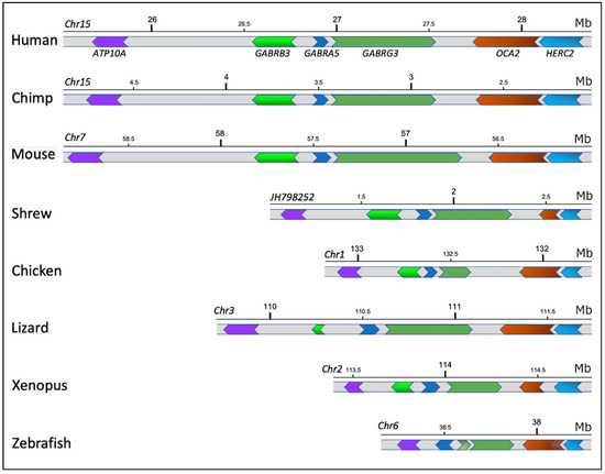 2.4. Genomic Organization of HERC2/OCA2 Region in Different Vertebrate Species