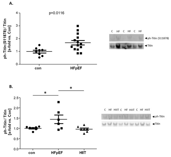 - Hamdani, N.; Franssen, C.; Lourenco, A.; Falcao-Pires, I.; Fontoura, D.; Leite, S.; Plettig, L.; López, B.; Ottenheijm, C.A.; Becher, P.M.; et al. Myocardial Titin Hypophosphorylation Importantly Contributes to Heart Failure with Preserved Ejection Fraction in a Rat Metabolic Risk Model. Circ. Heart Fail. 2013, 6, 1239–1249. [Google Scholar] [CrossRef] [PubMed]