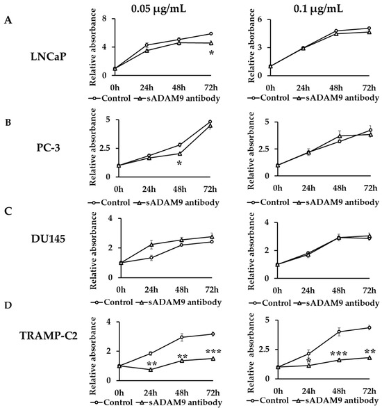 In LNCaP, a 0.05 µg/mL sADAM9 neutralizing antibody suppressed cell proliferation at 72 h (p = 0.0161) (Figure 1A). In PC-3, a 0.05 µg/mL sADAM9 neutralizing antibody suppressed cell proliferation at 48 h (p = 0.0131) (Figure 1B). In DU145, the sADAM9 neutralizing antibody did not inhibit cell proliferation significantly (Figure 1C). Furthermore, in TRAMP-C2, 0.05 µg/mL sADAM9 neutralizing antibody significantly inhibited cell proliferation at 24 h (p = 0.00343), 48 h (p = 0.00411), and 72 h (p = 0.000410), and 0.1 µg/mL sADAM9 neutralizing antibody also inhibited cell proliferation at 24 h (p = 0.0473), 48 h (p = 0.000681), and 72 h (p = 0.00142) (Figure 1D).