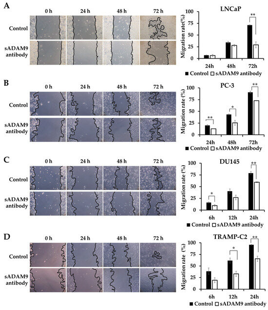 Comparison of the inhibitory effect on wound healing in the sADAM9 neutralizing antibody treatment and control groups. Microscopic images of the changes in the wound and graphs showing the covered area rates calculated from the images are shown. (A) The sADAM9 neutralizing antibody (sADAM9 antibody) significantly inhibited wound healing in LNCaP at 72 h (p =0.00281). (B) The PC-3 antibody was inhibited at 24 h (p = 0.00691), 48 h (p = 0.0295), and 72 h (p = 0.00179). (C) In DU145, the sADAM9 neutralizing antibody significantly inhibited wound healing at 6 h (p = 0.0410) and 24 h (p = 0.00543). (D) In TRAMP-C2, the sADAM9 neutralizing antibody significantly inhibited wound healing at 12 h (p = 0.0211) and 24 h (p = 0.00655) compared to the control. *: p < 0.05; **: p < 0.01. “Migration rate” means ”rate of covered area” in graphs. These graphs show the rate of wounds that have been closed by cell migration (100× magnification).