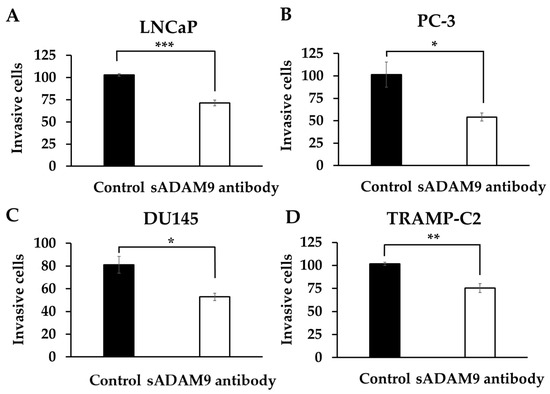 In LNCaP, the sADAM9 neutralizing antibody reduced invasive cells compared to controls (p = 0.000914) (Figure 3A). In PC-3 (Figure 3B), DU145 (Figure 3C), and TRAMP-C2 (Figure 3D), the sADAM9 neutralizing antibody groups also had fewer invasive cells than the control groups (PC-3: p = 0.0327, DU145: p = 0.0254, and TRAMP-C2: p = 0.00776).