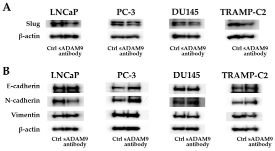 As for Slug, the sADAM9 neutralizing antibody decreased the expression in LNCaP, DU145, and TRANP-C2, but in PC-3, there was no significant difference between the control and sADAM9 neutralizing antibody groups (Figure 4A). In LNCaP, the expression of N-cadherin decreased with the administration of the sADAM9 neutralizing antibody (sADAM9 antibody) (Figure 4B). The sADAM9 neutralizing antibody increased the expression of E-cadherin in PC-3 (Figure 4B) and decreased the expression of Vimentin in DU145 (Figure 4B). Furthermore, in TRAMP-C2, the sADAM9 neutralizing antibody increased the expression of E-cadherin and decreased the expression of Vimentin compared to the control (Ctrl) group (Figure 4B).