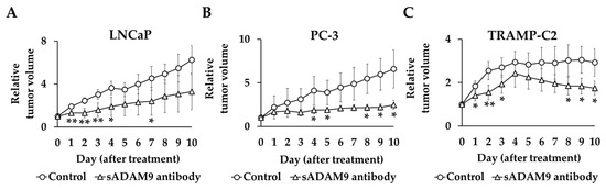 The tumor volume before administration of the antibody in each group was set at 1, and the relative tumor volume was compared between the treatment and control groups (Figure 5). In TRAMP-C2, the sADAM9 neutralizing antibody significantly inhibited tumor growth on day 1 (p = 0.0394), day 2 (p = 0.00619), day 3 (p = 0.0343), day 8 (p = 0.0280), day 9 (p = 0.0136), and day 10 (p = 0.0165). The relative tumor volumes in LNCaP were also significantly smaller in the sADAM9 neutralizing antibody group than controls on day 1 (p = 0.00274), day 2 (p = 0.00276), day 3 (p = 0.00711), day 4 (p = 0.0140), and day 7 (p = 0.0382). The sADAM9 neutralizing antibody inhibited tumor growth in PC-3 on day 4 (p = 0.0500), day 5 (p = 0.0460), day 8 (p = 0.0417), day 9 (p = 0.0356), and day 10 (p = 0.0450).