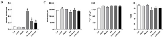 Cp-induced SNE caused severe intestinal erosion as evidenced by the separation of lamina propria and intestinal epithelium, necrosis, and exfoliation of numerous epithelial cells, which were alleviated by the addition of genistein (Figure 1A). Furthermore, the intestinal lesion scores were higher in the Cp group compared with the control group, which was alleviated by genistein supplementation (Figure 1B). Notably, only 40 mg/kg genistein supplementation significantly increased the duodenal villus height of broilers in comparison with the control group (Figure 1C). Additionally, Cp infection markedly reduced villus height and the ratio of villus height to crypt depth, whereas supplementation of genistein alleviated the negative impact of Cp on the villus height of the duodenum (Figure 1C).