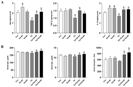 Genistein enhances immune responses in the intestine and serum of broilers. (A) The content of sIgA, TGF-β, and IL-10 in the jejunal mucosa of broilers was measured by ELISA kits. (B) The concentration of serum IgG and IgA of broilers was determined by ELISA kits. The lysozyme activity was measured by lysozyme assay kits. Con, basal diet; Gen40, basal diet supplemented with 40 mg/kg genistein; Gen80, Gen80 diet; Cp, basal diet and Cp infection; Cp+Gen40, Gen40 diet and Cp infection; Cp+Gen80, Gen80 diet and Cp infection. The differences among groups were determined by ANOVA using Duncan’s test. The results are presented as mean ± SEM, n = 12. Letter a indicates p < 0.05 vs. Con group; letter b indicates p < 0.05 vs. Cp group.