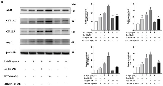 IL-4-stimulated macrophages were treated separately with genistein, FICZ (AhR agonist), CH223191 (AhR antagonist), or a combination of genistein and CH223191 in the presence of IL-4 for 24 h. The western blot analysis demonstrated that IL-4 treatment significantly induced the protein expression of AhR, CYP1A1, and CD163 in comparison with the control group. In comparison with the IL-4 stimulation group, the induction of AhR, CYP1A1, CD163, and Arg-1 proteins was significantly higher in the presence of FICZ and genistein, with FICZ demonstrating a more pronounced effect (Figure 5D). However, the above protein levels were suppressed by CH223191 treatment in the presence of genistein (Figure 5D). Notably, we observed similar changes in the mRNA levels of IL-10 (Figure 5C), which is the primary anti-inflammatory cytokine secreted by M2 macrophages.