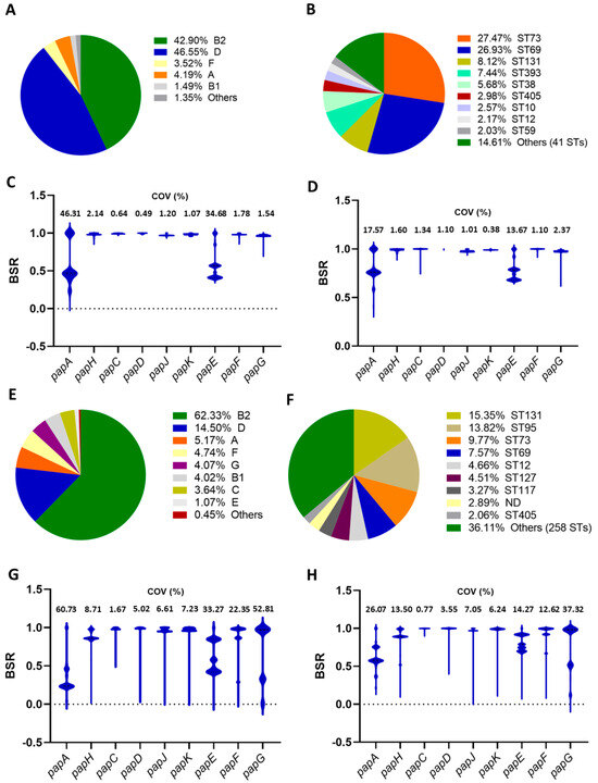 Distribution of E. coli genotypes among genomes positives for detecting the pap locus and screening of pap genes. (A,B) Distribution of phylogroups (A) and sequence types (B) among 739 genomes selected after the detection of papAHCDJKEFG with large-scale blast score ratio software (LS-BSR) using blastn and a cutoff of BSR ≥ 0.9. (C,D) BSR values for the screening of pap genes with blastn (C) or tblastn (D) among the 739 genomes. (E,F) Distribution of phylogroups (E) and sequence types (F) among 4005 genomes selected after the detection of papC with LS-BSR using tblastn and a cutoff of BSR ≥ 0.9. (G,H) BSR values for the screening of pap genes with blastn (C) or tblastn (D) among the 4005 genomes. BSR: blast score ratio, COV: coefficient of variation.