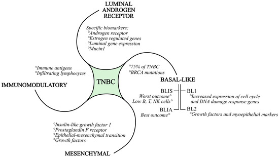 The intense genomic and transcriptional heterogeneity of TNBC is responsible for the complexity of defining appropriate molecular targets in preclinical studies. Burstein et al. proposed, after RNA and DNA profiling, a four-type classification of TNBC (Figure 1): basal-like immuno-suppressed (BLIS), basal-like immuno-activated (BLIA), mesenchymal (MES), and luminal androgen receptor type (LAR) [21]. Lehmann et al. redefined the TNBC subtypes as follows: basal-like (BL1 and BL2), immunomodulatory (IM), MES, and LAR [22]. For each subtype, the following is to be mentioned: BLIS tumors have the worst outcome, while BLIA tumors have the best outcome; the LAR subgroup is defined by specific biomarkers and targets, such as the androgen receptor MUC1 and several estrogens regulated genes. The MES subgroup is defined by IGF1, which is the prostaglandin F receptor [21]. A characteristic of the BL1 subtype is the increased expression of cell cycle and DNA damage response genes. The BL2 subtype is defined by growth factor signaling and myoepithelial markers. As already mentioned, the basal-like subtypes constitute 75% of TNBC. According to studies, basal-like immunosuppressed TNBC subtypes have lower numbers of B cells, T cells, and natural killer cells, resulting in a poorer prognosis.