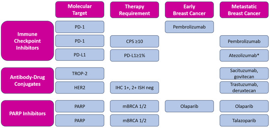 Overview of targeted therapy for early and metastatic triple-negative breast cancer with included molecular expression for each molecule. Magenta boxes: header row and column, blue boxes: molecular targets, categorized by types of therapy and including the specific requirements for the use of each therapy in early and metastatic breast cancer; All listed medicines are approved by EMA and FDA, except * atezolizumab, which is approved by EMA only [61,62]. CPS—Combined Positive Score; IHC—immunohistochemical score; ISH—in situ hybridization.