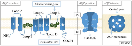 The crystal structures of AQPs reveal high similarities in their structures (Figure 3). They are tetramers, with each monomer functioning independently of the others and forming the central pore [70]. Each monomer consists of six transmembrane α-helices with five loops (loops A–E) in between [71]. Loops B and E are of special importance to aquaporin gating [72]. These loops have an NPA motif (asparagine–proline–alanine) that are located in the center of the channel [73]. The specificity of channeling is dictated by these motifs that form an hourglass structure [74], thereby providing maximized permeability and optimized hydrodynamic transport [75]. Another constriction site, the aromatic/arginine (ar/R) constriction site, is near the extracellular side of the pore [76]. Residues at the ar/R site are variable in the AQP family, being the factor that causes AQPs to differ in size and hydrophobicity, as well as channel selectivity [77,78]. The importance of this site in selectivity is supported by the study of Beitz et al., which showed that point mutation in the ar/R region dictates the selectivity of the channel [77]. In addition, the ar/R region is wider in aquaglyceroporins than in aquaporins [76].