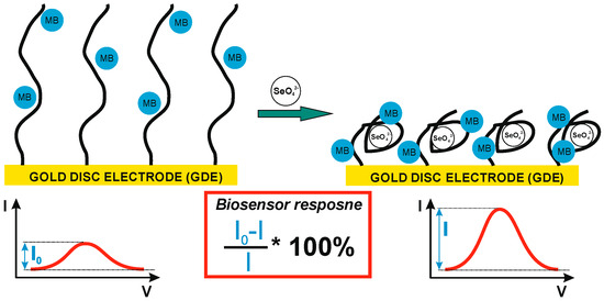 Briefly, as the redox indicator (the only electroactive compound in the used potential range, approximately from −0.2 to 0.8 V) is freely available in the sample, the electrochemical biosensor response will depend on the change in the efficiency of its oxidation or reduction. This efficiency, in turn, depends on the possibility and easiness of reaching the electrode surface. As it changes together with binding the analyte by the receptor layer, the observed changes in redox current are translated into the biosensor response (Figure 1). In the presented studies, ultimately, the cationic marker, methylene blue, was chosen, and the observed tendency in redox current changes is shown in Figure 1. However, as several such indicators are available, which differ in structure and charge and share a mechanism of interaction with DNA strands, this ultimately translates into smaller or larger changes in redox reaction efficiency triggered by binding of the analyte (e.g., selenate ion) by the receptor layer; initially two such indicators were investigated as the source of the signal for the biosensor response [46]. These were (i) methylene blue, an aromatic compound exhibiting a positive charge, and (ii) an equimolar mix of ferro-/ferricyanide with a negative charge. Moreover, the evaluation of the biosensor response registered for such different redox markers may point to its source.