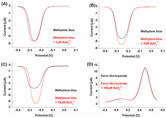 SWV voltammograms. (A–C): Biosensor response registered with methylene blue as a redox marker with an increasing selenate ion concentration (from 1 to 12 μM); (D): biosensor response registered with ferro-/ferricyanide as a redox marker with a selenate ion concentration of 100 μM.
