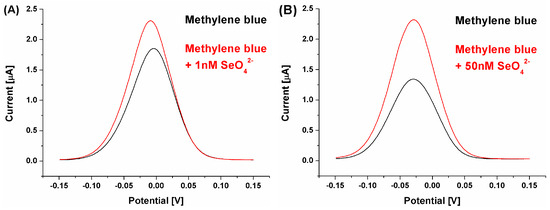 SWV voltammograms for biosensor response registered with methylene blue (pH 4.0) as a redox marker and for selenate ion concentration at the level of (A) 1 nM and (B) 50 nM.
