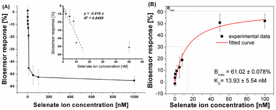 (A) Dependency between selenate ion concentration and calculated biosensor response (result obtained for SWV experiments, n = 4); (B) plot of the absolute aptasensor electrochemical responses (transformed to positive values versus calculated with the equation presented in Figure 1) in the function of analyte concentration for the determination of equilibrium dissociation constant (KD). Black points represent experimental points; red curve represents fitting through non-linear regression according to the “one-to-one” kinetic model.