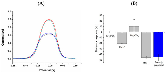 From the analyzed condition, the regeneration process took place only for sodium carbonate, and the appropriate current change after subsequent selenate ion determination was obtained (Figure 10A). The investigations on biosensor storage were conducted in 1 M pf KH2PO4 at pH 4.5, 5 mM of EDTA at pH 7.5, (used in the presented studies as solution for DNA immobilization), 0.5 M of Na2CO3 at pH 10.5, and water solution of 2 mM of 6-mercapto-1-hexanol (MCH). From the analyzed conditions, only the biosensor that was kept in 2 mM of MCH was able to obtain similar results for the determination of 50 nM selenate ion at a similar level to the freshly prepared biosensor (Figure 10B).