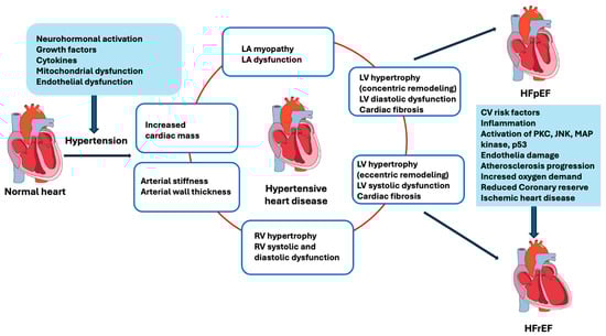 Progression from hypertension to heart failure. CV; cardiovascular; HFpEF; heart failure with preserved ejection fraction; HFrEF; heart failure with reduced ejection fraction; JNK, c-Jun N-terminal kinase; LA, left atrium; LV, left ventricle; MAP, mitogen-activated protein kinase; PKC; protein kinase C; RV, right ventricle.
