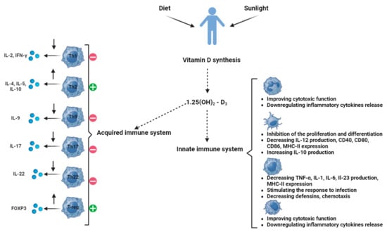 One of the most important roles of VD is the regulation of the immune system, having different effects on immune cells such as macrophages, monocytes, dendritic cells, T-cells, and B-cells []. Monocytes are involved in infection defense, as they produce inflammatory cytokines. VD induces the production of peptides such as β-defensin 2 and cathelicidin, inhibits NF-KB activation, and modulates the epigenetics of macrophages, inducing subtype differentiation and even autophagy []. Dendritic cells play the role of antigen-presenting cells, activating adaptive immune responses. Active VD reduces the expression of stimulatory molecules on dendritic cells and the expression of MHC II molecules. In addition, VD suppresses the production of dendritic cell cytokine IL-12 and IL-23 but promotes the expression of cytokine IL-10 [,,]. T-cells interact closely with antigen-presenting dendritic cells. Both of them express VDR and CYP27B1, therefore VD also has an effect on T-cells by suppressing their proliferation and differentiation, as well as decreasing the secretion of inflammatory cytokines. In the case of B-cells, VD inhibits the differentiation into memory cells and plasma cells, decreasing B cells’ overall function [,,,,].