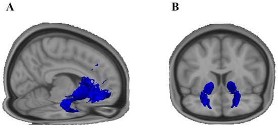 - Tzoutio-Mazoyera, N.; Landeau, B.; Papathanassiou, D.; Crivello, F.; Etard, O.; Delcroix, N.; Tzourio-Mazoyer, B.; Joliot, M. Automated anatomical labeling of activations in SPM using a macroscopic anatomical parcellation of the MNI MRI single-subject brain. Neuroimage 2002, 15, 273–289. [Google Scholar] [CrossRef]