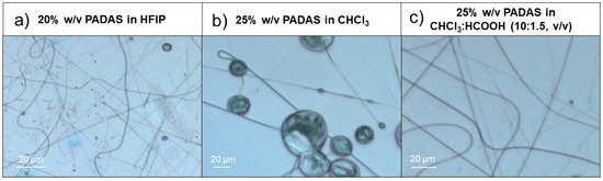 Alternatively, chloroform was similarly tested because it is a more economical solvent, less corrosive, and safer than HFIP. At 10% and 15% w/v, the solutions tested had a very low viscosity, which prevented the formation of fibers. It was necessary to increase the concentration up to 20% or 25% w/v (Figure 1b) to obtain fibers. However, even at that concentration, many beads were detected. To improve the quality of the fibers, formic acid was added in the ratio of 10:1.5 (v/v) to increase the conductivity of the solution and prevent bead formation. Under these conditions, PADAS concentrations of 20% and 25% w/v were tested. The latter concentration produced the best fibers, as shown in Figure 1c.