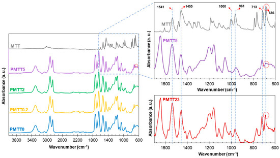 FTIR spectra of MTT and MTT/PADAS mats. For illustrative purposes, on the right side of the figure, an enlargement of the area of the spectra of interest to compare MTT and PMTT5 is presented. The dashed lines show the coincident bands between PADAS and MTT. The red circles show the 686 cm−1 peak, which is the only one confirming the presence of MTT in PMTT5 by this analysis technique. The spectrum of PMTT23 confirms that the 686 cm−1 peak becomes more intense at higher MTT concentrations.