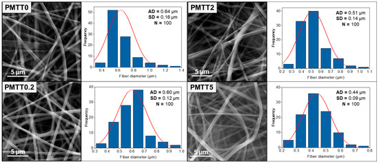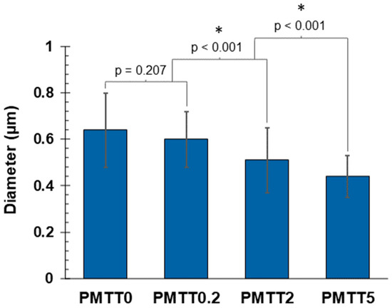 From the outcomes of ANOVA with a Tukey’s simultaneous test for mean differences (Table S1, Supplementary Information), it could be concluded that the diameters of the PMMT0 and PMTT0.2 fibers are statistically equal, which is logical because the amount of MTT added is minimal. For PMTT2 and PMTT5 fibers, there is a statistically significant difference, demonstrating that the fiber diameter decreases as the amount of MTT increases (Figure 5).