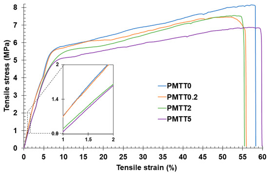 Mechanical properties, including ultimate tensile strength and Young’s modulus, are crucial in assessing the ability of MTT/PADAS mats to resist tearing and rupture. To evaluate the influence of MTT incorporation, tensile assays were carried out. The recorded stress–strain curves and the corresponding mechanical parameter measurements are shown in Figure 6 and Table 2, respectively.