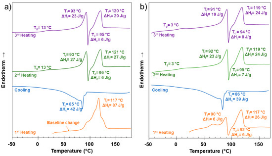 To corroborate the most amorphous character of samples made from electrospinning, the thermal behavior of PMTT2 was analyzed. As can be seen in Figure 7b, the melting enthalpy of both the melt-crystallized sample (2nd heating run) and the quenched sample (3rd heating run) was lower than that of the corresponding to PADAS as synthesized (Figure 7a). The lower degree of crystallinity is expected in an electrospun polymer, where the chains are less organized [28] could also explain a higher mobility of the polymeric chains and a higher free volume in the structure, which can lead to the reduction of Tg from 13 °C to 3 °C observed in PMTT2. A further explanation of DSC of PADAS can be found in Section S2 and Figure S3 (Supplementary Information).