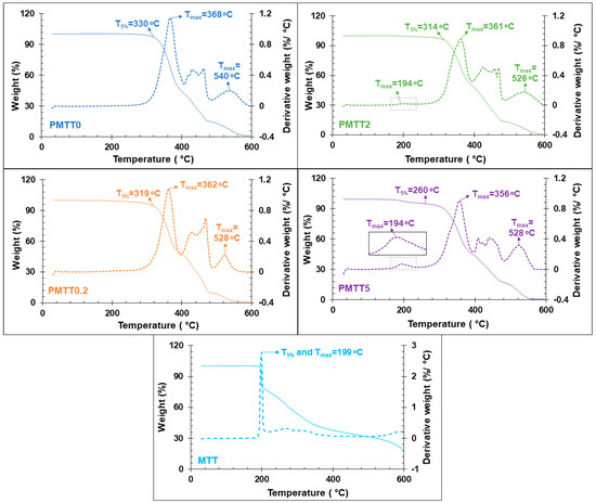 In all cases, a complex degradation process with more than three stages of decomposition was observed. For PMTT0, the first step appeared at 368 °C and the last at 540 °C. The arrows on the curves indicate the values of the initial degradation temperature measured at 5% weight loss (T5%) and the maximum decomposition temperature (Tmax). PMTT0, which begins to degrade at 330 °C, is the most thermally stable, whereas a small loss of stability is observed when the MTT content increases.
