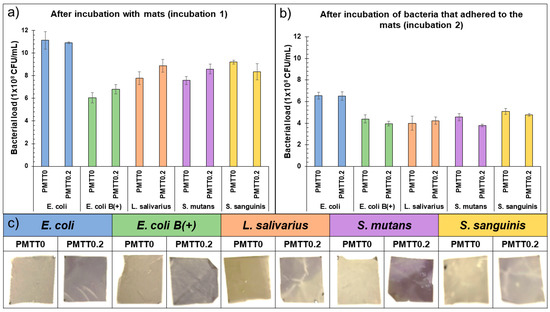 The prepared bacterial suspensions for the experiment had a cell density of 7.9 × 103 CFU/mL, 6.7 × 103 CFU/mL, 7.1 × 103 CFU/mL, 3.5 × 103 CFU/mL, and 6.3 × 103 CFU/mL in the case of E. coli, E. coli B(+), L. salivarius, S. mutans, and S. sanguinis, respectively. Table 3 summarizes the bacterial count after 24 h of incubation of the listed bacteria suspensions in the presence of PMTT0 or PMTT0.2 mats (incubation 1). In addition, the bacteria density after 24 h of incubation of the recovered bacteria that adhered to the evaluated mats can be similarly consulted in this table (incubation 2). For comparative purposes, these results also depicted in Figure 9a and Figure 9b, respectively. From the results, it can be inferred that, regardless of the bacteria strain, there was a similar growth in the presence of MTT-free and MTT-loaded electrospun mats. Interestingly, the evaluated MTT concentration did not only negatively impact the bacterial growth but was also adequate to demonstrate their presence, as evidenced by the color change of the fibers from yellow to purple. This color variation was registered photographically after 24 h of incubation (Figure 9c).