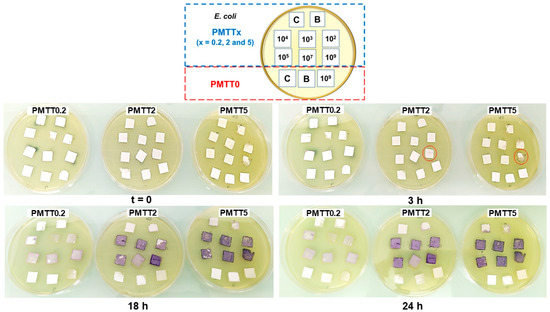 The photographs of the Petri dishes at different time points are shown in Figure 10. At the beginning of the experiment, all the samples showed similar characteristics, despite the MTT concentrations. After 3 h, the samples of the PMTT2 and PMTT5 groups that were immersed in the E. coli suspensions (with a cell density of 109 CFU/mL) started to show small purple dots, as highlighted by the red circles in the corresponding image.