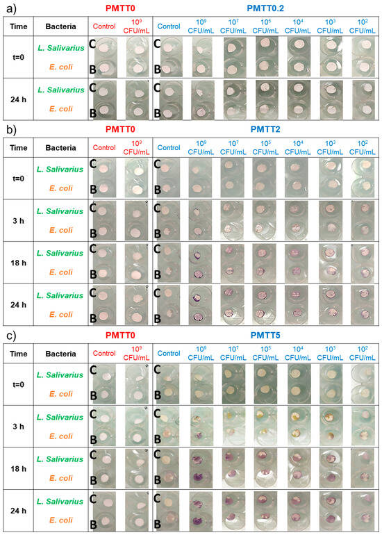 For PMTT2 (Figure 11b), after 3 h, the first hints of purple pigmentation were seen in all samples, regardless of the bacteria classification or cell count. After 18 h, the purple intensity increased in each sample and remained constant until the end of the observation (24 h), with the most visible coloration occurring with bacterial counts from 104 to 109 CFU/mL. For the bacterial densities of 102 and 103 CFU/mL, there were visible purple stains at the edges of the samples, but the staining was not as intense and uniform as observed with higher cell numbers. Thus, the sensitivity limit of PMTT2 was established at 104 CFU/mL.