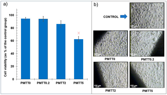 Samples of PMTT0, PMTT0.2, PMTT2, and PMTT5 were considered for an in vitro viability assay on COS-1 cells to assess the potential toxicity of any of the MTT/PADAS mats. As depicted in Figure 12a, the highest viability values were reported for the PMTT0 and PMTT0.2 groups, with a 94% value with respect to the control. Conversely, a decrease in viability could be observed with an increasing concentration of MTT. In this matter, 86% of viability was described in the PMTT2 group, while the cytotoxicity exhibited by the PMMT5 group reached 38% (62% of viability). The results of the viability assays could also be evidenced by optical microscopy. Representative micrographs of the growth of the COS-1 cells in the presence of the tested materials can be observed in Figure 12b. Due to the opacity of the fibers, the cells could not be visualized directly on the surface of the samples, so the presented micrographs correspond to the cells immediately adjacent to the mats (noticeable as the dark areas on each picture). Despite the lower value obtained with the PMTT2 mats, the viability percentage remains acceptable for the intended applications of the material. As for the PMTT5 fibers, the viability percentage is too low to be considered in future studies, so it was decided to mark them with a red X in Figure 12a.